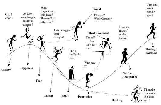 แต่แน่นอนว่าความหวานอมขมกลืนนั้นมันเป็นธรรมดาโลก มีทฤษฎีหนึ่งที่อธิบายเรื่องความเปลี่ยนแปลงว่าทำไมตอนเริ่มต้นอันสดใสถึงกลายเป็นฝันร้ายเมื่อเวลาผ่านไปได้ มันเรียกว่า kubler ross change curve หรือทฤษฎีความเปลี่ยนแปลงแบบกราฟระฆังคว่ำ (ดูภาพประกอบ)
