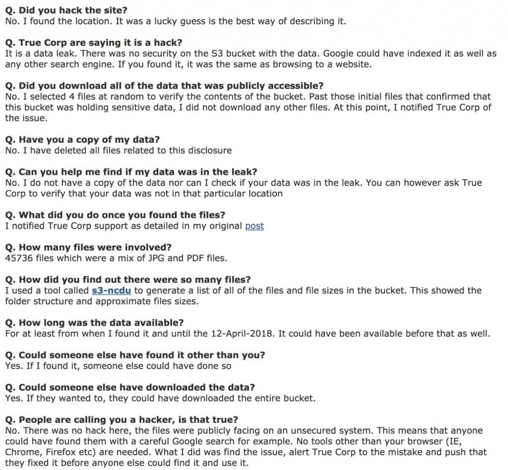 (1) วันที่ 8 มีนาคมที่ผ่านมา Niall Merrigan นักวิจัยด้านความปลอดภัยลองแสกน Bucket ดังกล่าวพบว่า มีไฟล์ภาพหน้าบัตรประชาชนของลูกค้า TrueMove H เปิดเป็น public ให้ใครต่อใครสามารถเข้าถึงได้ ซึ่งจนถึงตอนนี้ ยังไม่มีใครทราบว่าข้อมูลดังกล่าวได้หลุดออกไปขนาดไหน