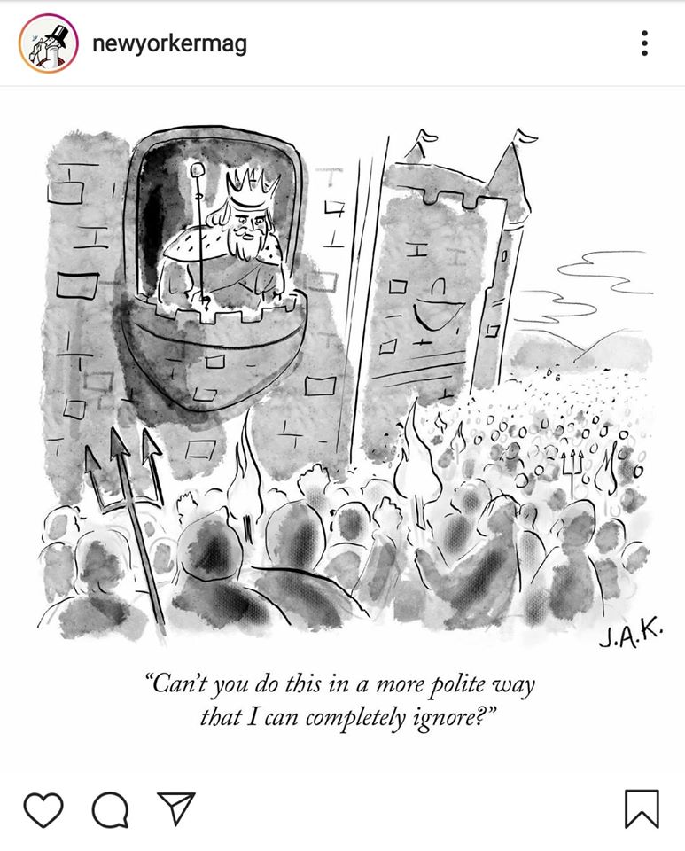 ขอปิดท้ายด้วยการ์ตูนจาก The Newyorker รูปด้านล่างนี้เลย ที่เป็นตัวแทนความรู้สึกของผู้มีอำนาจต่อการเรียกร้องแบบสันติวิธีได้เป็นอย่างดี