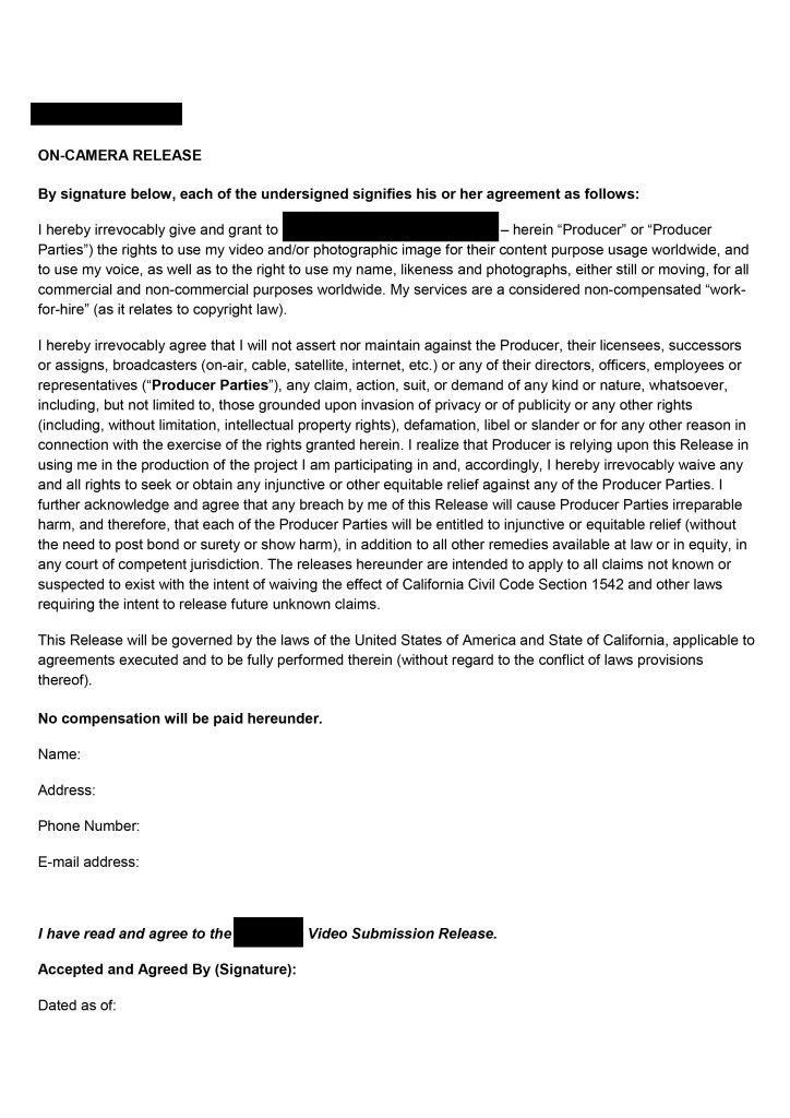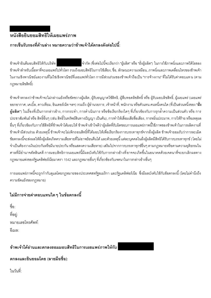 ตัวอย่างงานแปลเอกสาร On-Camera Release (หนังสือยินยอมสิทธิให้เผยแพร่ภาพ) จากภาษาอังกฤษเป็นภาษาไทย